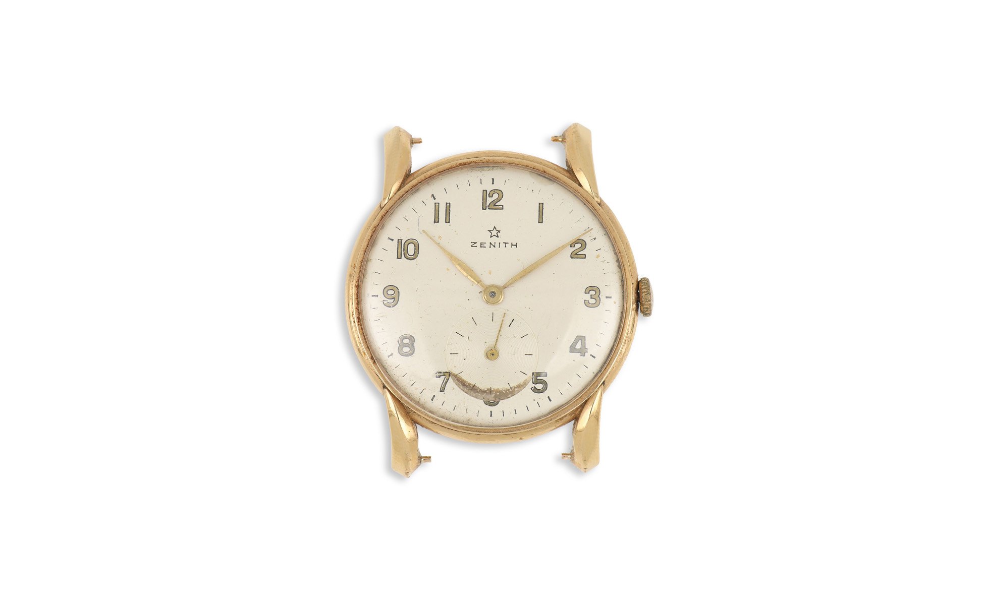 ZENITH orologio da uomo in oro giallo con cinturino in pelle elegante modello di forma rotonda animato da movimento meccanico a carica manuale quadrante crema indici con numeri arabi piccoli secondi a ore 6. Fibbia non originale.