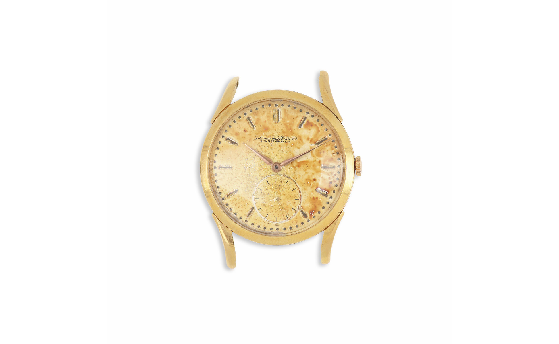 IWC orologio da uomo in oro giallo con cinturino in pelle elegante modello di forma rotonda animato da movimento meccanico a carica manuale quadrante crema indici a bastone piccoli secondi a ore 6. Fibbia non originale.