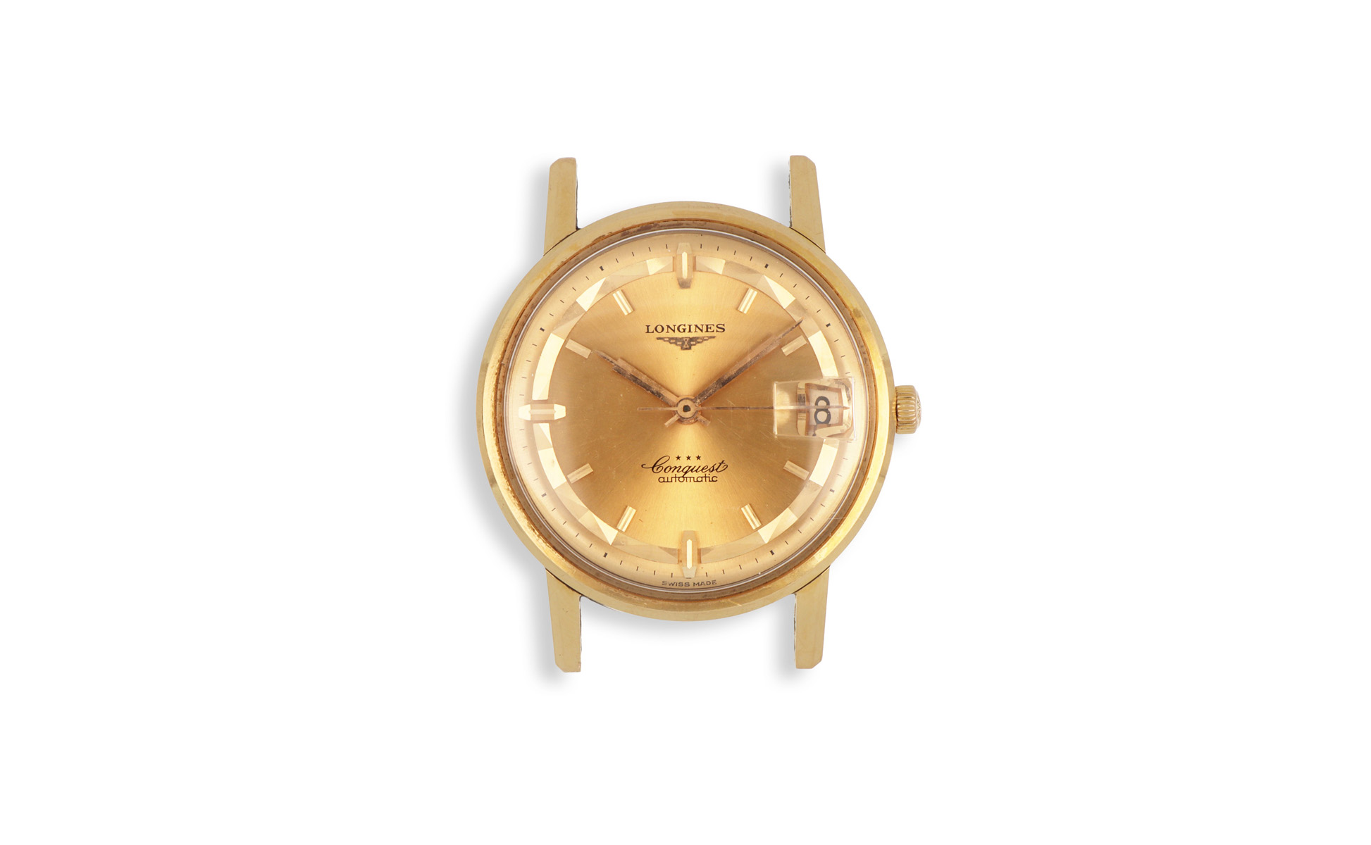 LONGINES orologio da uomo in oro giallo con cinturino in pelle fibbia non originale modello Conquest animato da movimento meccanico a carica automatica quadrante oro con indici a bastone secondi al centro e datario ad ore 3.