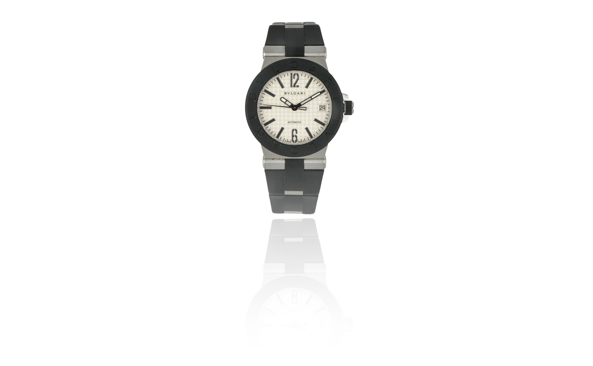 BULGARI orologio da uomo in acciaio e gomma modello Diagono movimento meccanico a carica automatica lunetta con incisa la scritta Bulgari quadrante tapiserie argentè con piccoli secondi al centro e datario ad ore 3 corona a vite cinturino in gomma con fibbia originale.