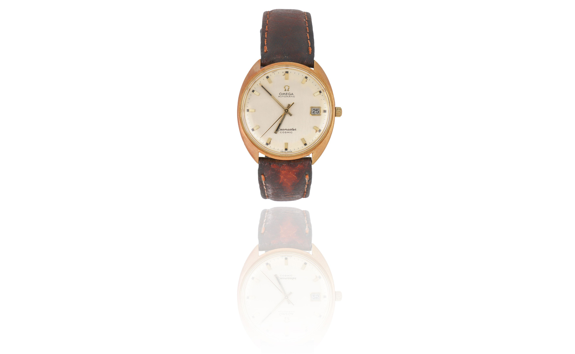 OMEGA orologio da uomo in oro giallo modello Seamaster Cosmic animato da movimento meccanico a carica automatica quadrante argentè con indici rettangolari datario ad ore 3 cinturino in pelle mancante di fibbia originale.