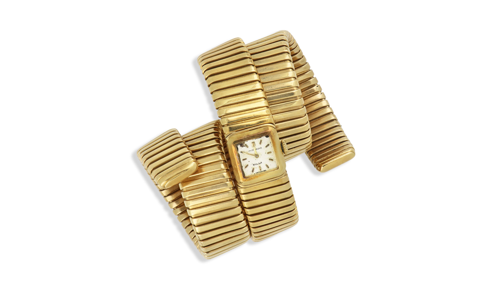 MOVADO PER BULGARI Orologio da donna in oro giallo con cinturino tubogas flessibile movimento meccanico a carica manuale funzionante.