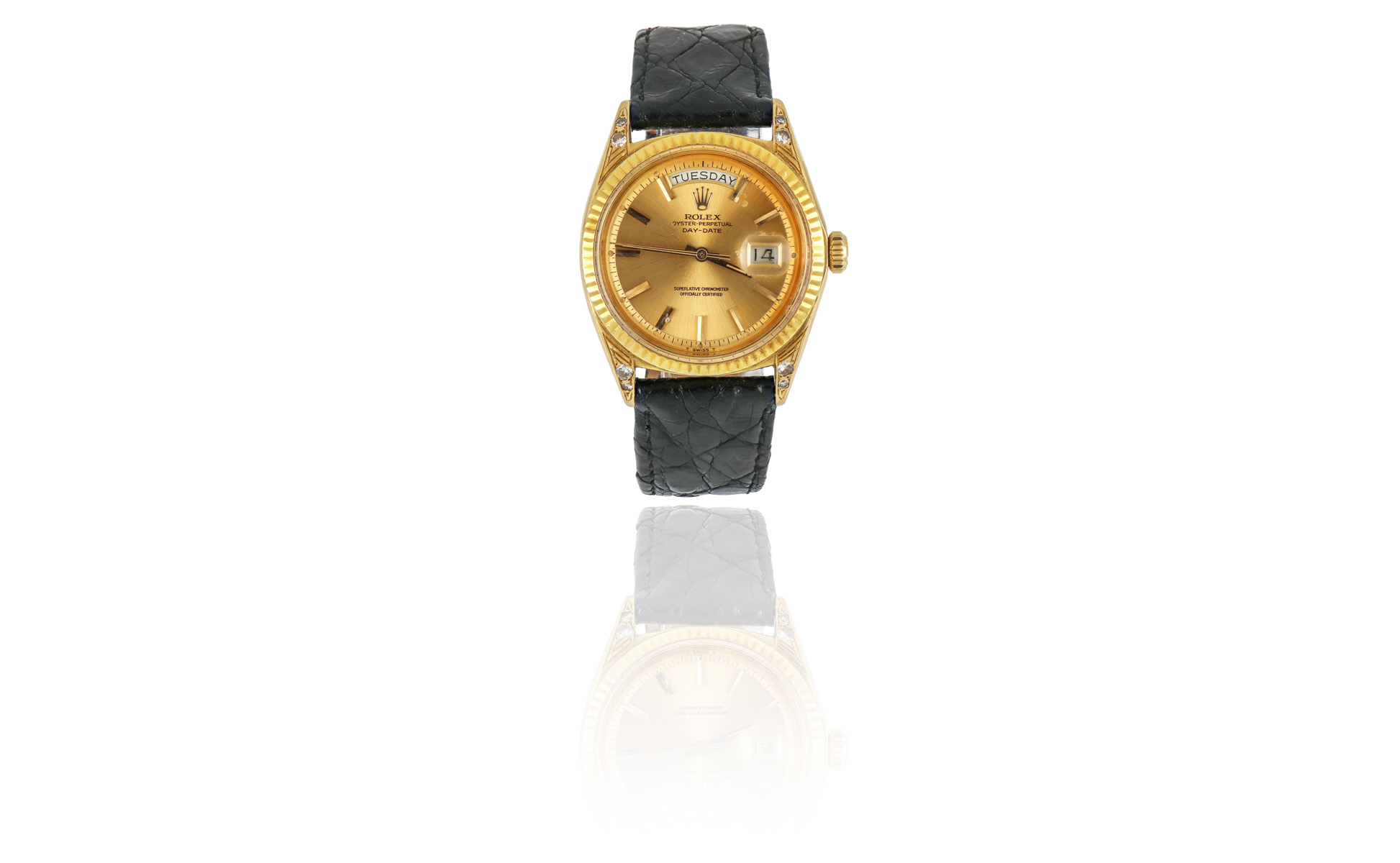 ROLEX - Orologio da polso meccanico a carica automatica modello Date Date ref 1803 con cassa 36 mm in oro giallo con anse impreziosite da diamanti taglio a brillante quadrante oro soleil data in inglese.