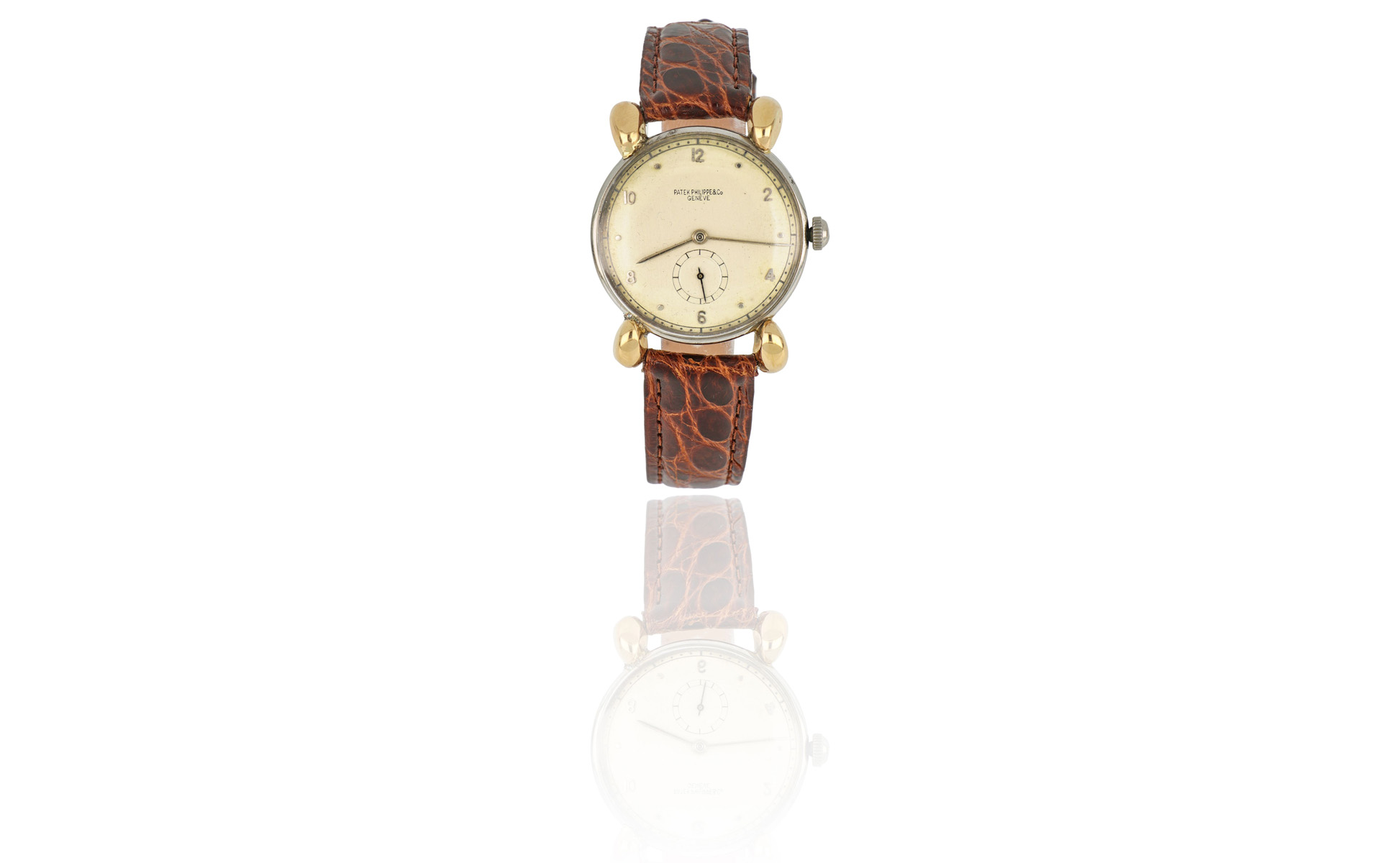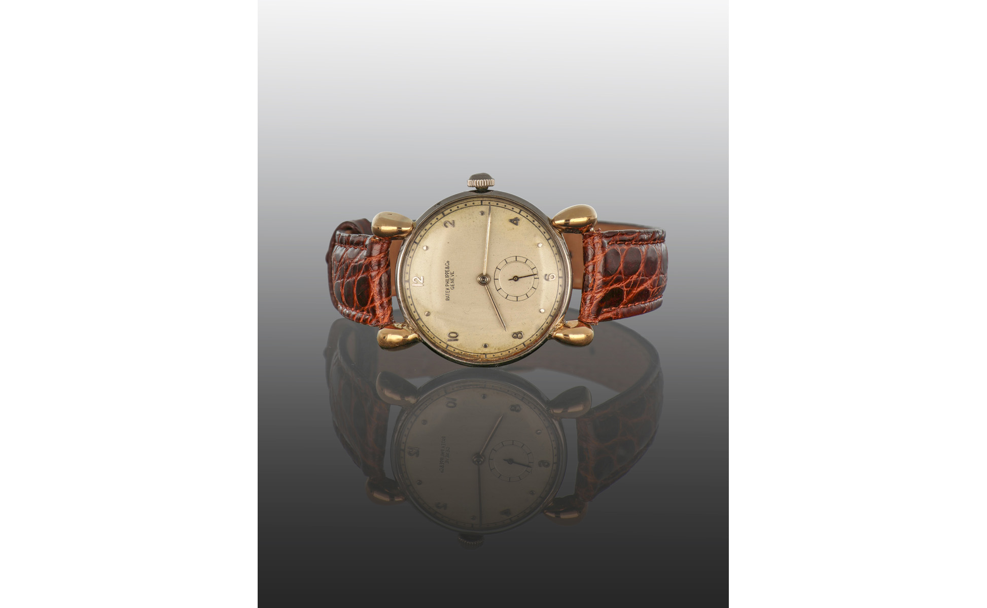 PATEK PHILIPPE - anno 1944 - Orologio meccanico a carica manuale animato dal calibro 10'''110 referenza 1461 cassa in acciaio con anse a goccia in oro (due sono state riparate) quadrante argenté sfere a bastone piccoli secondi alle 6 indici arabi ai pari. Estratto degli archivi Patek Philippe.