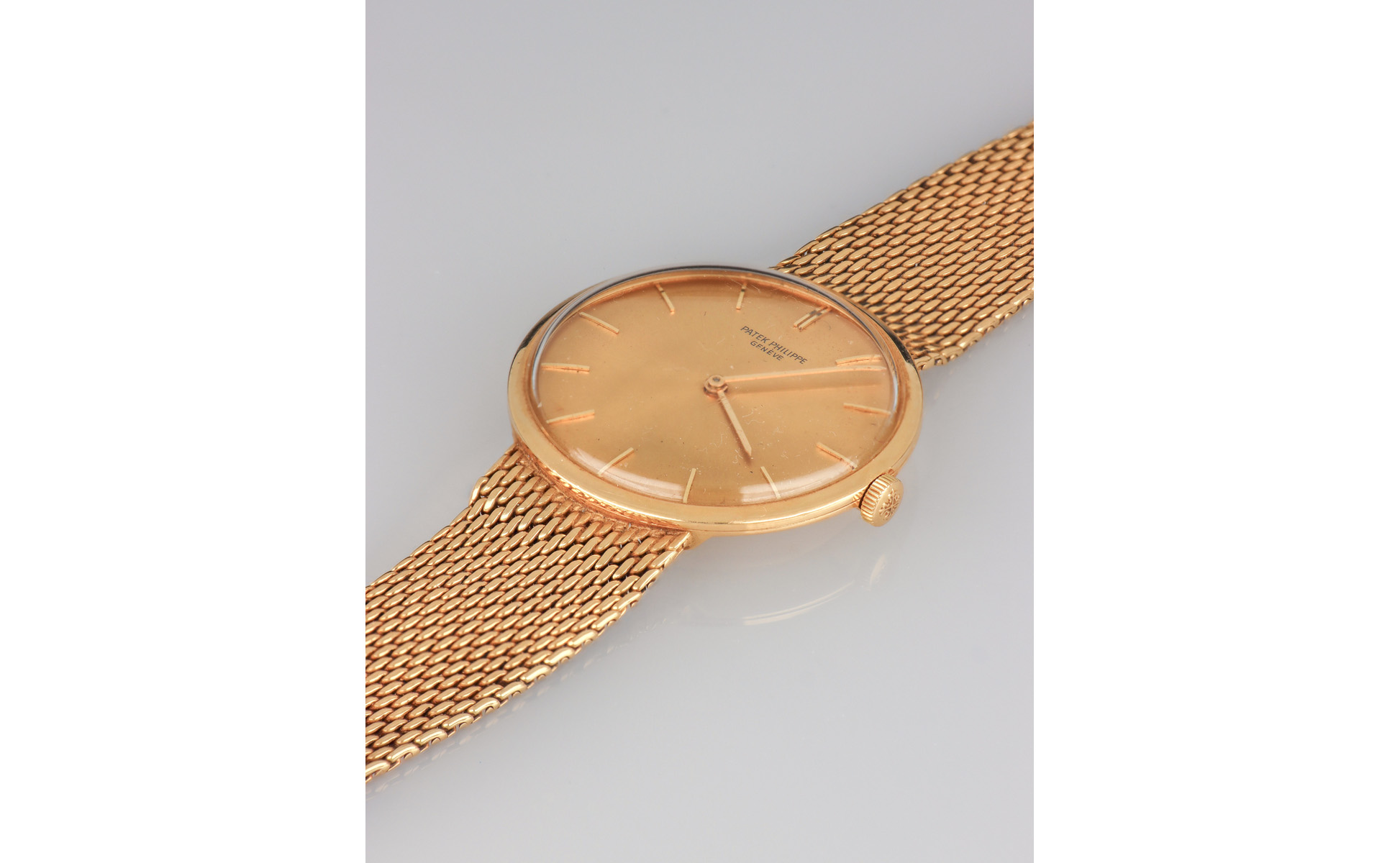 PATEK PHILIPPE Calatrava - Orologio da polso in oro giallo con movimento meccanico a carica manuale calibro 23-300 Referenza 3562/1. Quadrante oro soleil indici e sfere a bastone vetro plastica cassa in oro da 33 mm bracciale in oro con particolare chiusura brevetto Patek.
