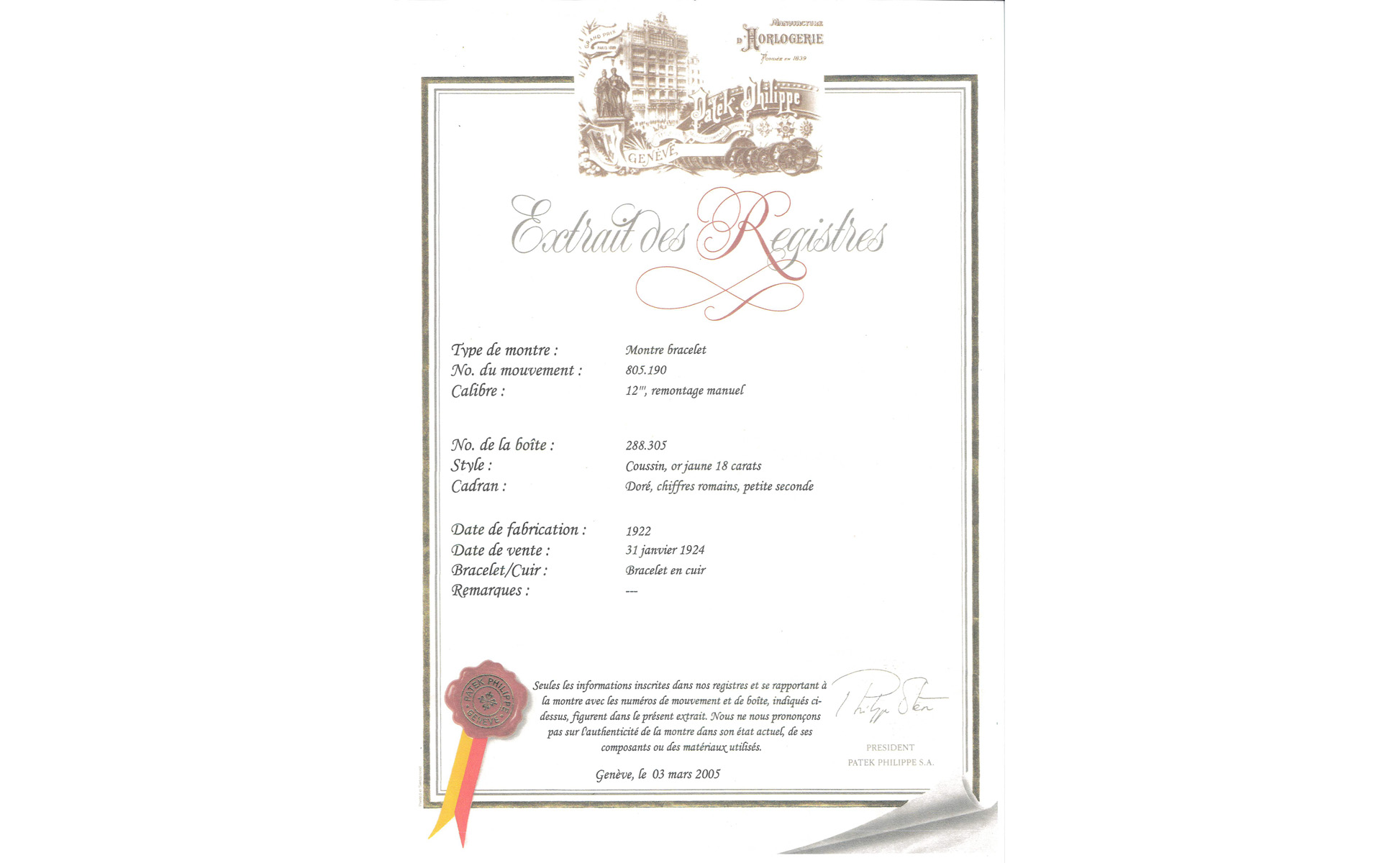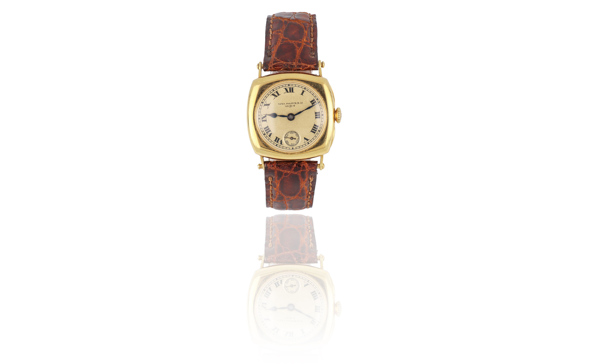 PATEK PHILIPPE - anno 1922 - Raro e fascinoso orologio da polso in oro animato da movimento meccanico a carica manuale calibro 12''' particolare cassa a cuscino in oro indici romani piccoli secondi a ore 6. Ottime condizioni corredato da estratto degli archivi Patek Philippe.