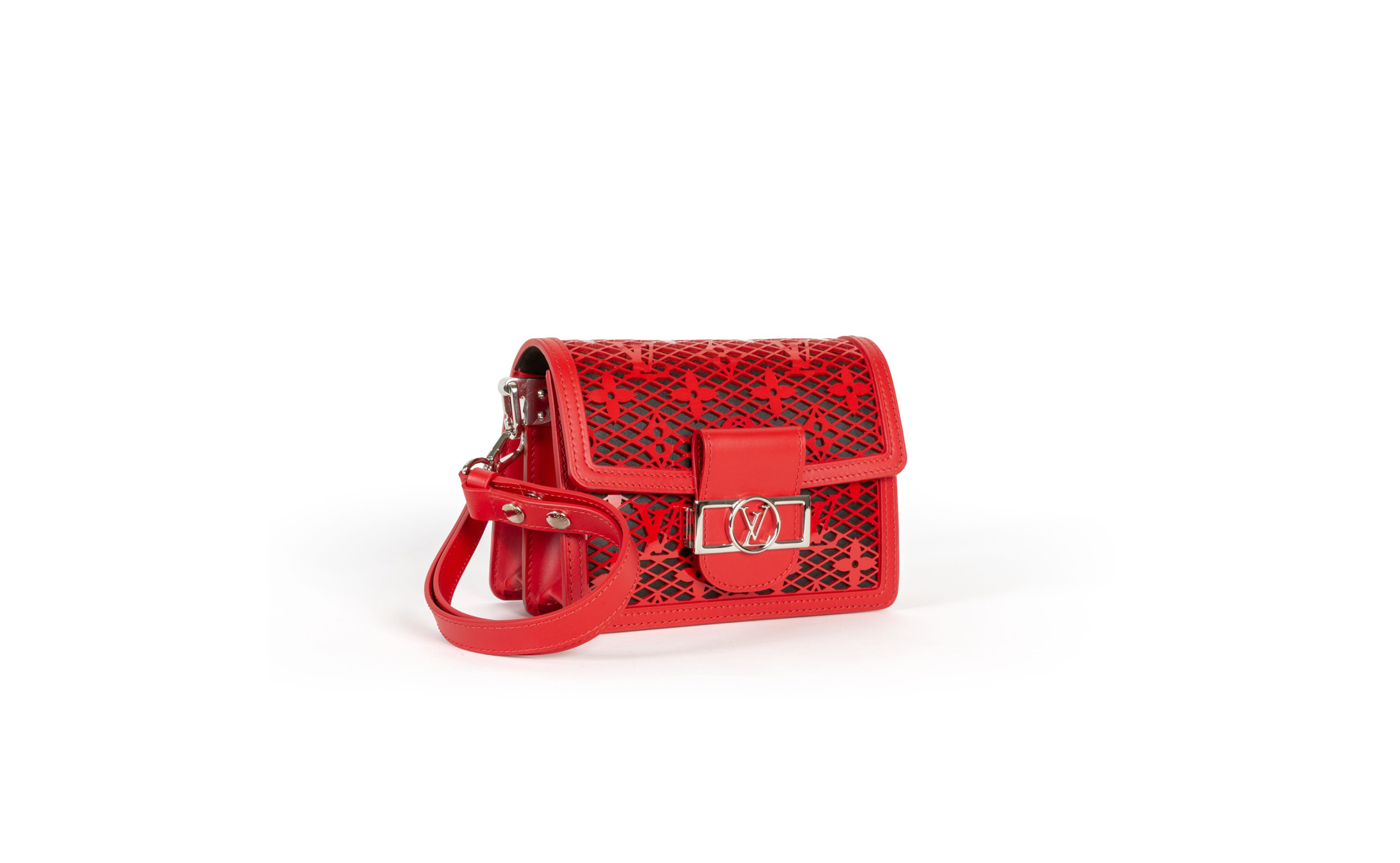 Borsa a tracolla in pelle traforata al laser con finitura laccata rossa lucida che rivela l'interno in pelle e raso nero con motivo Monogram. Iconico sistema di chiusura LV twist in metallo. Manico superiore e tracolla regolabile in pelle rossa con dettagli in metallo.