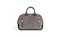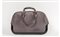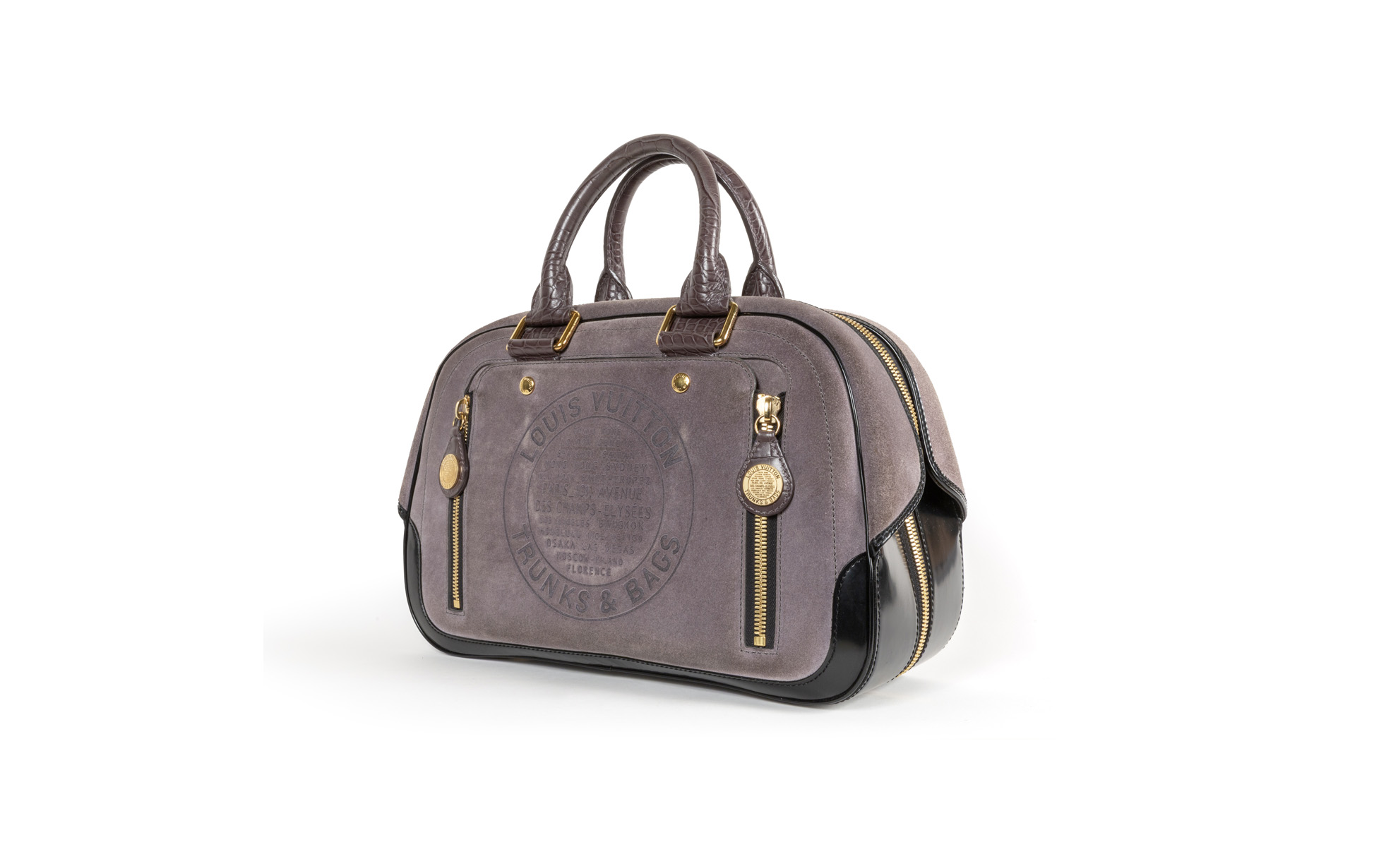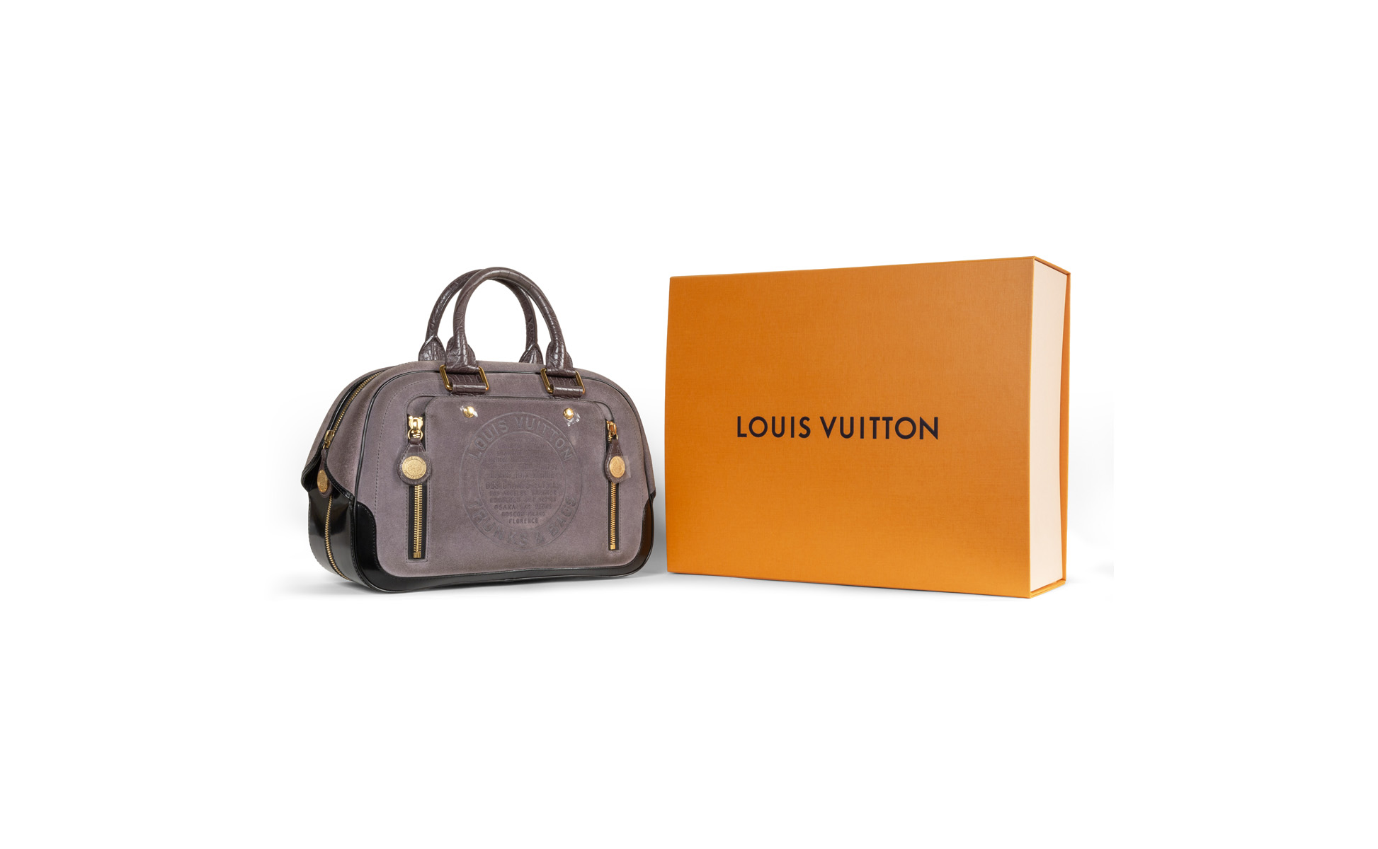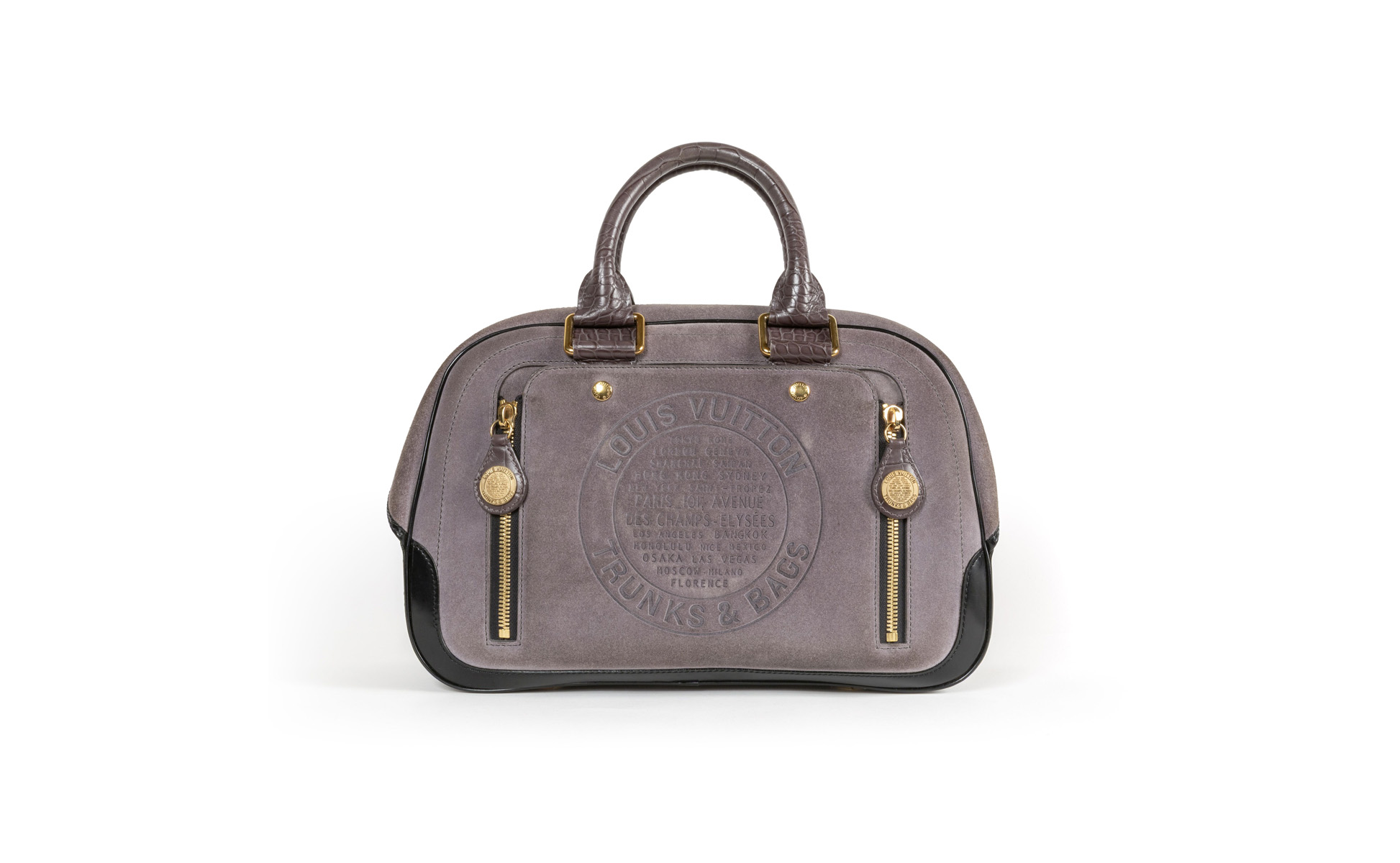 Borsa a mano realizzata in suede grigio cenere. La pannellatura frontale presenta un'impressione a caldo circolare con la storica dicitura Louis Vuitton Trunks & Bags circondata da un elenco delle principali città legate alla tradizione della Maison.
