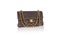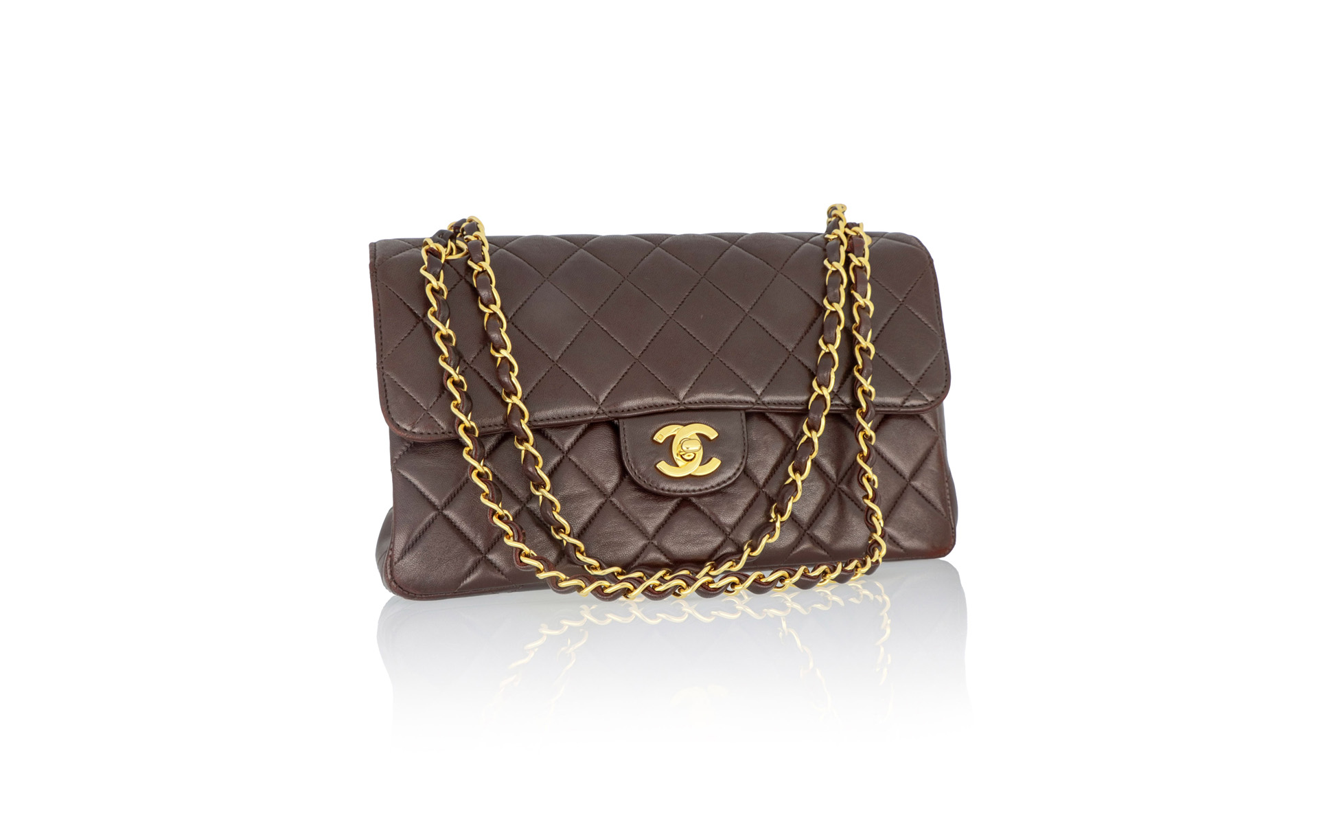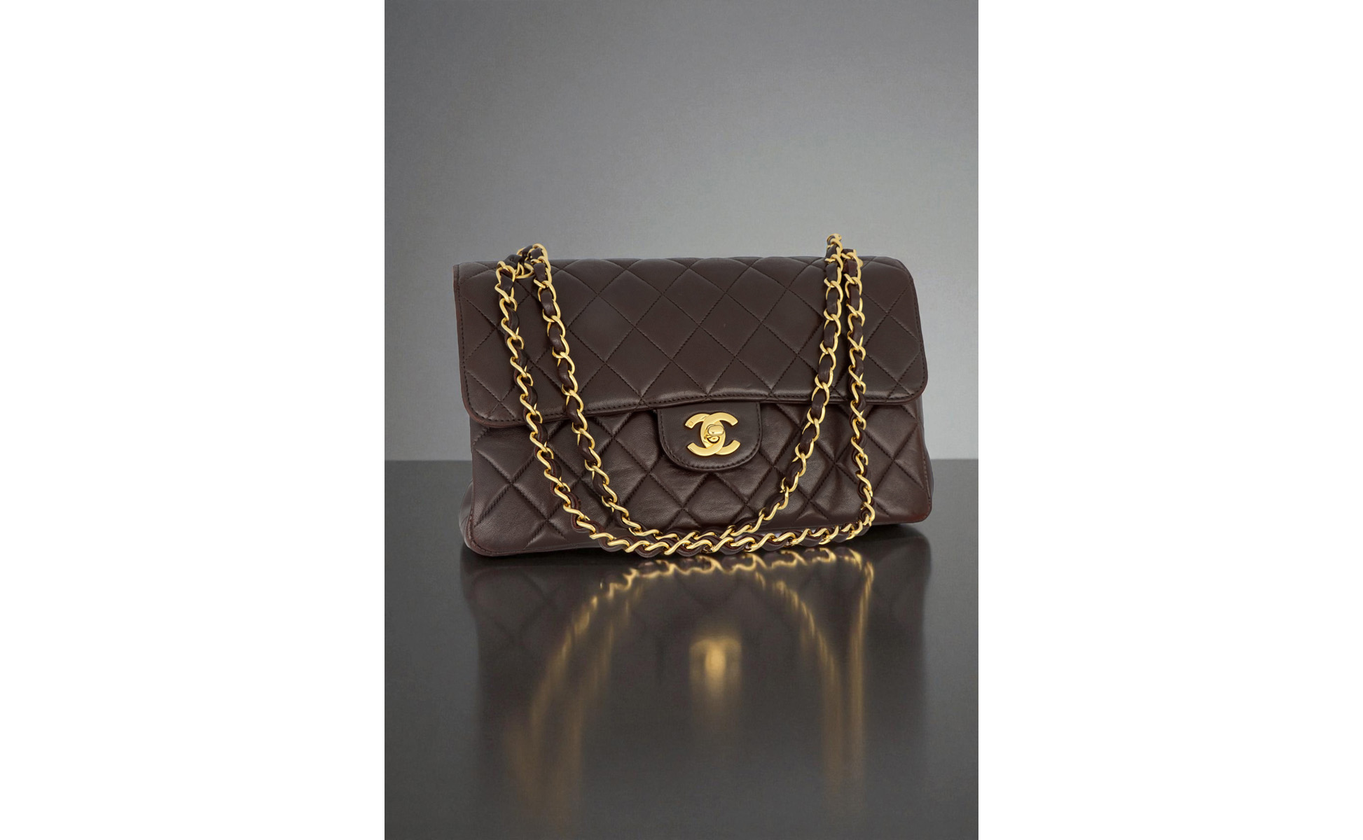 Elegante borsa Chanel modello Double Classic realizzata in morbida pelle martellata color marrone lavorata con l'iconica impuntura a rombi impreziosita dalla chiusura con logo CC intrecciato in metallo dorato. La silhouette rigida ma raffinata è completata dal manico a catena con intreccio in pelle elemento distintivo delle creazioni della Maison. Anno 1996/1997.