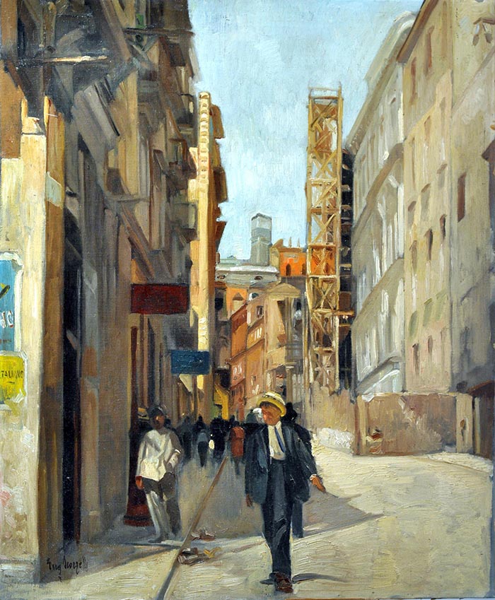 Scorzelli Eugenio (Buenos Aires - Argentina 1890 - Napoli 1958) Via Mezzocannone in ricostruzione olio su tela, cm 67x55 firmato in basso a sinistra: Eug. Scorzelli