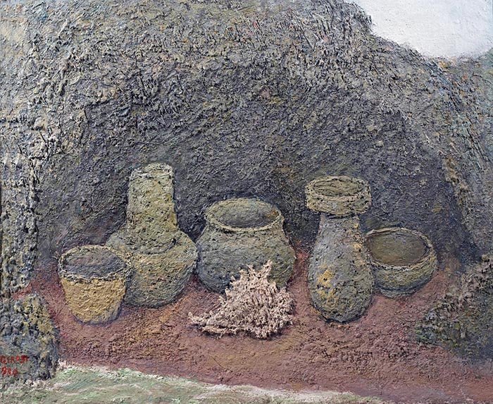 Girosi Franco (Napoli 1896 - 1987) Cocci con conchiglia olio su tavola, cm 58x70 firmato e datato in basso a sinistra: Girosi 980 a tergo cartiglio dell'artista