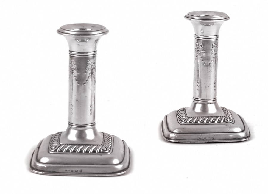 COPPIA DI CANDELIERI IN ARGENTO Birmingham, 1921 orafo Ellis Jacob Greenberg, stelo a colonna decorato da nodi d'amore e poggiante su base squadrata, h. cm. 12 peso lordo 600 gr.
