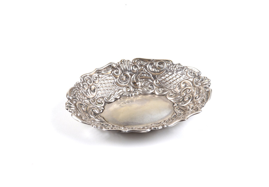PICCOLO CESTINO IN ARGENTO Chester, 1962 forma ovale con bordo sagomato e decorato a motivi floreali e vegetali, cm. 17x12 peso 90 gr.