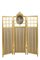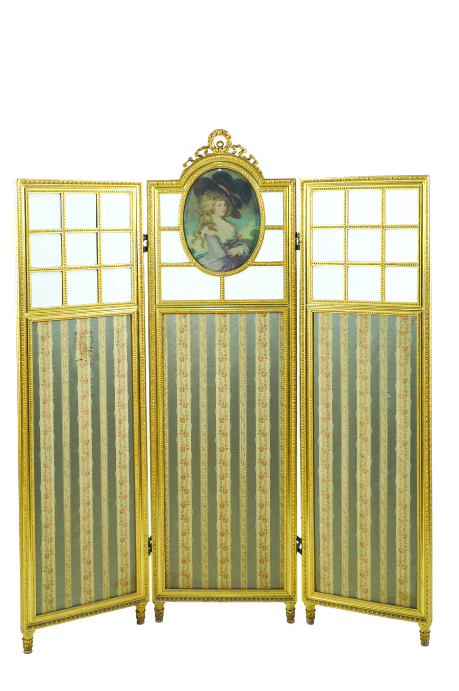 PARAVENTO IN LEGNO INTAGLIATO E DORATO Francia, fine XIX Sec. a tre ante in vetri molati e tessuto, centrato da un dipinto ovale su carta raffigurante ritratto femminile, difetti 174x140 cm.