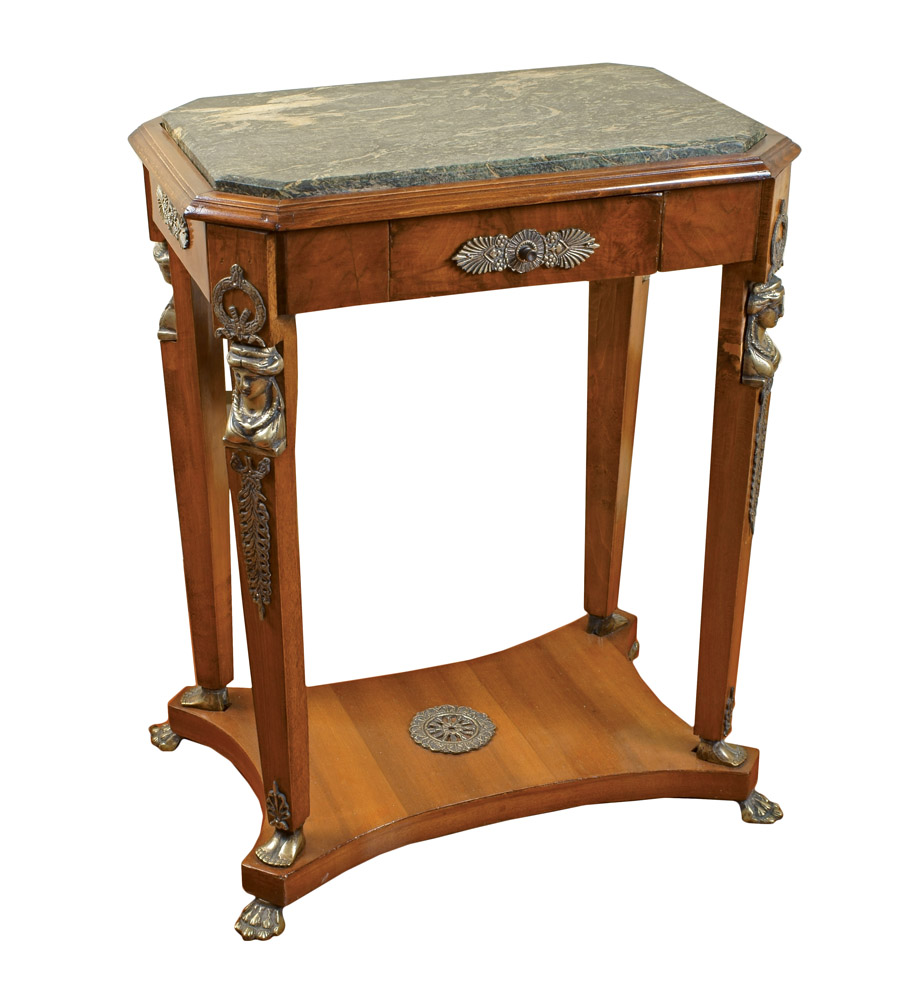 TAVOLINO IN MOGANO STILE IMPERO Francia XX Sec. piano ottagonale in marmo verde, fascia sottostante ad un cassetto poggiante su quattro sostegni con applicazioni in bronzo, riuniti in basso da un ripiano 83x66x44 cm.