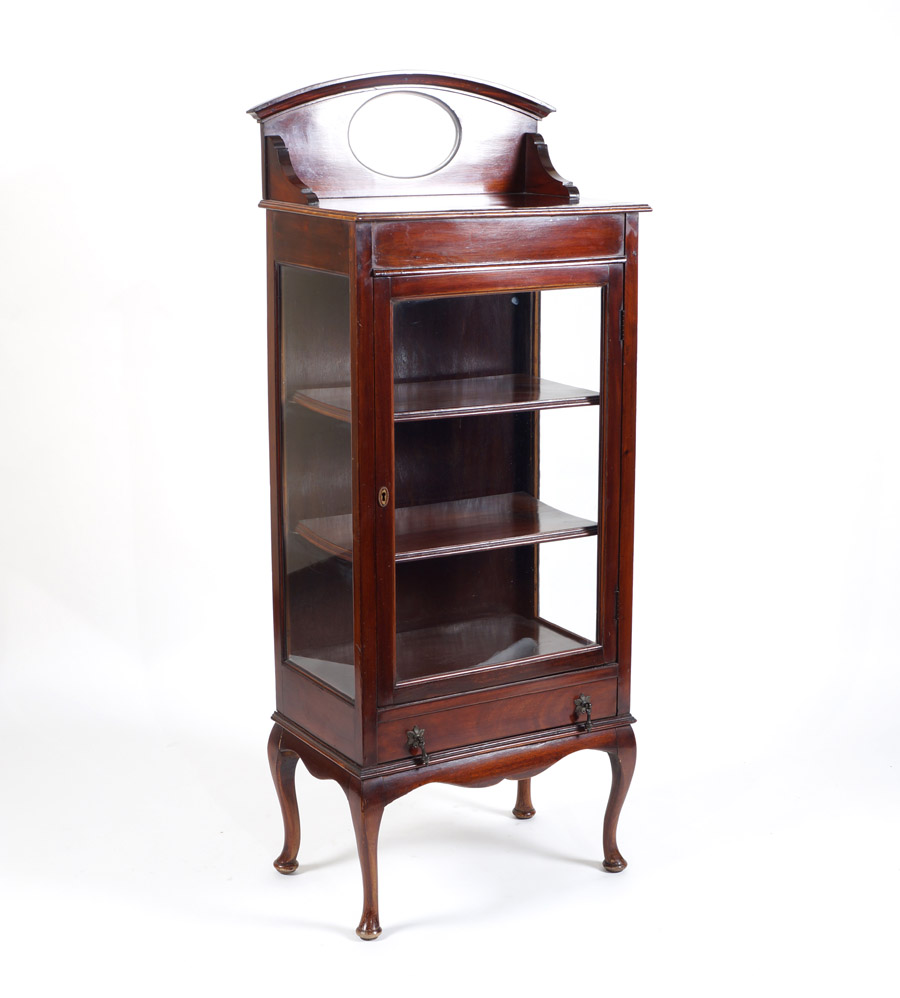 VETRINETTA IN MOGANO Inghilterra, primi anni XX Sec. piano rettangolare con alzata centrata da uno specchio di forma circolare, fronte ad uno sportello a vetri con due ripiani all'interno ed un cassetto sottostante, gambe di linea mossa 147x59x36 cm.