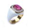 ANELLO A TROMBINO IN ORO GIALLO 18KT con stesura di smalto bianco, al centro un rubino taglio ovale per ct 2,60 circa circondato da diamanti taglio brillante per 0,30 punti circa, misura 9,5 (lievi difetti) peso 11 gr.