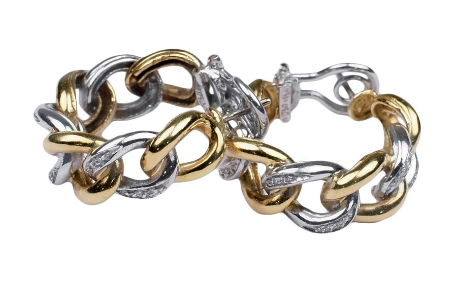 ORECCHINI A CERCHIO IN ORO GIALLO 18KT a maglia groumette alternate a maglie in oro bianco con diamanti taglio brillante per 0,24 punti peso 23,7 gr.