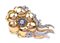 SPILLA FIORE IN ORO ROSSO 18KT anni 40 con al centro un diamante taglio brillante per 0,48 punti circa circondato da zaffiri tondi per 0,40 punti circa e altri diamanti taglio brillante per 0,25 punti circa, cm. 6,5x4 peso 19,20 gr.