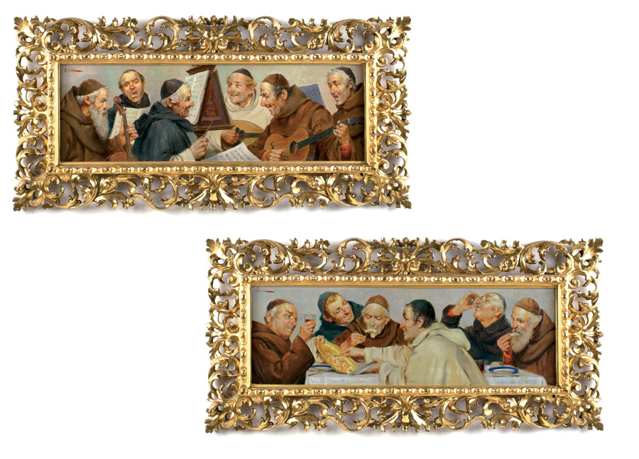 PIETRO TORRINI Firenze, 1852 - 1914 "Scene d'interno di convento", coppia di oli su tela, firmati in alto a sinistra, entro cornici finemente intagliate e dorate 20x60 cm.