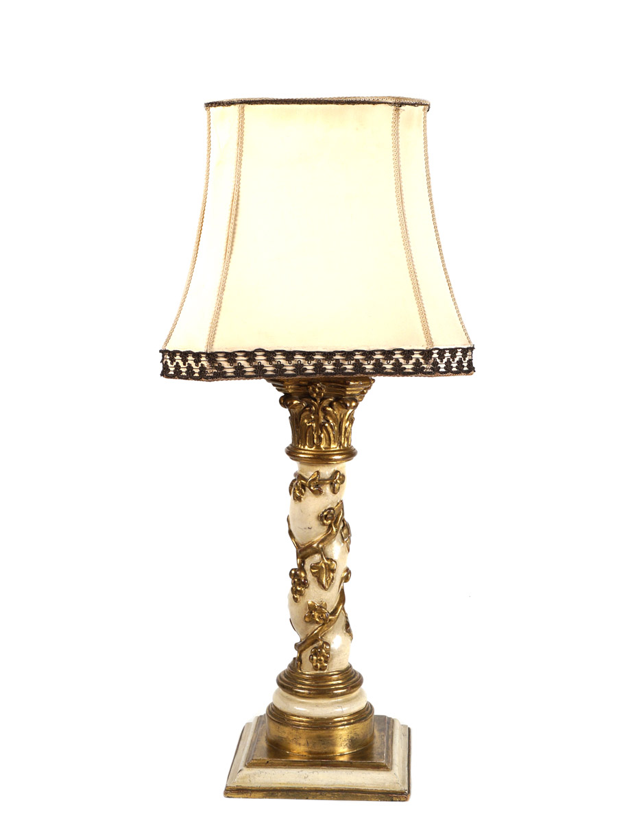 LAMPADA DA TAVOLO Italia, XX Sec. in legno laccato e dorato, stelo tornito a motivo di torchon intagliato a foglie di vite e grappoli d'uva con sopra un capitello corinzio, base di linea squadrata, completa di paralume h. 87 cm.