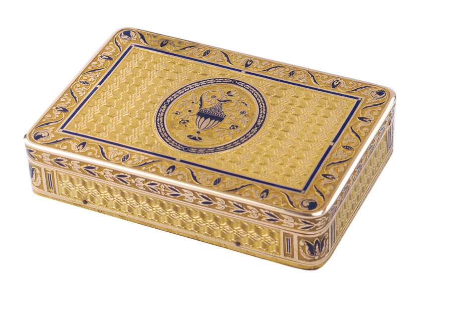 TABACCHIERA MUSICALE IN ORO GIALLO E SMALTO probabilmente Svizzera, XIX Sec. di forma rettangolare con angoli arrotondati, superfice martellata con decorazioni in smalto blu cobalto a motivi floreali e di volute, cm. 2x8x5,5 peso lordo 160 cm.