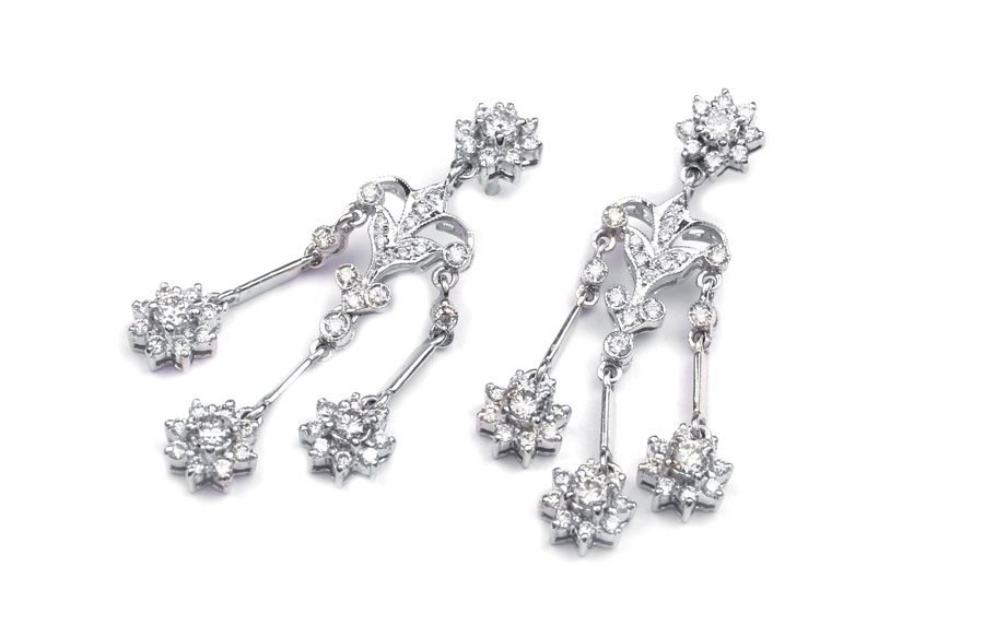 ORECCHINI PENDENTI A MOTIVO FLOREALE IN ORO BIANCO 18KT con diamanti taglio brillante per ct 1,50 circa peso 7,2 gr.