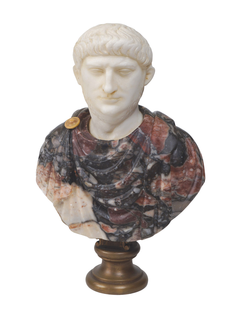 BUSTO IN MARMO RAFFIGURANTE IMPERATORE ROMANO fine XIX Sec. in marmo bianco statuario e Africano, base a plinto in bronzo brunito 28x19x10 cm.