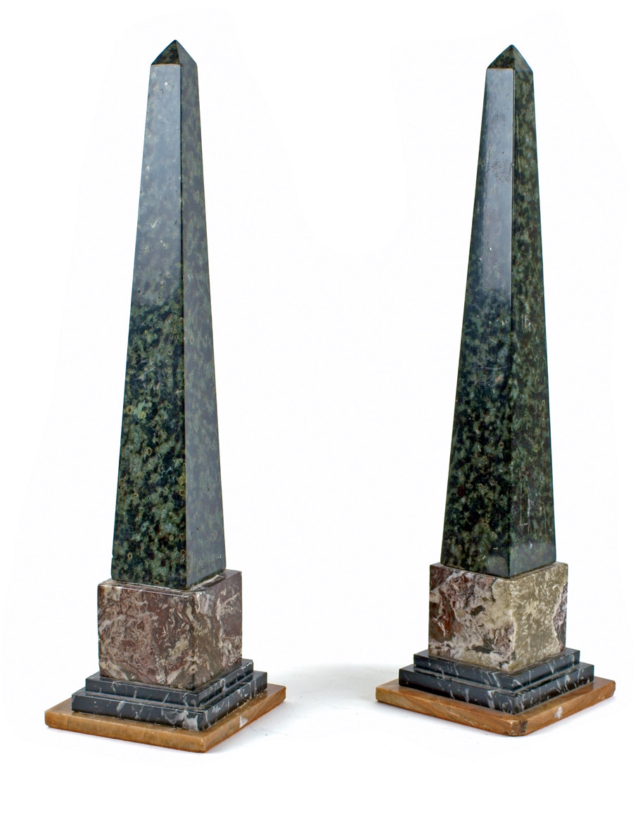 COPPIA DI OBELISCHI IN MARMI VARI Italia, XIX Sec. (difetti) h. 44 cm.