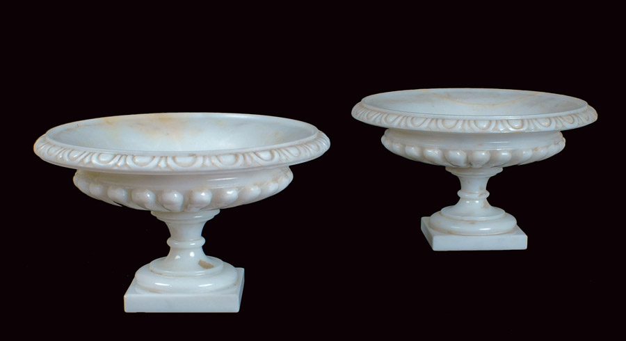 COPPIA DI ALZATE IN MARMO BIANCO DI CARRARA Italia, inizio XX Sec. coppe di forma circolare e corpo baccellato, base a plinto squadrata (una presenta restauri) 22x36 cm.