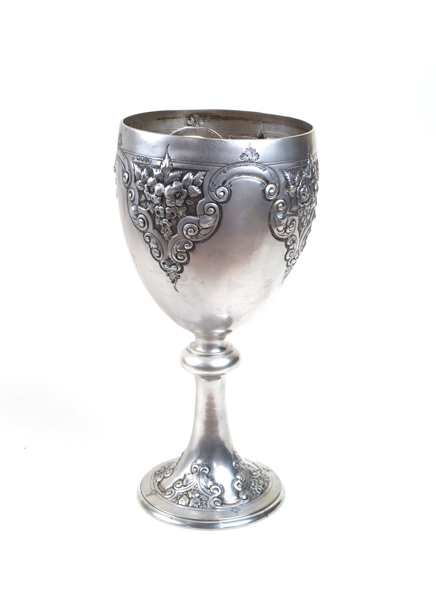 GRANDE COPPA IN ARGENTO Londra, 1880 incisa e sbalzata a motivi floreali e di volute, h. cm. 34 peso 754 gr.