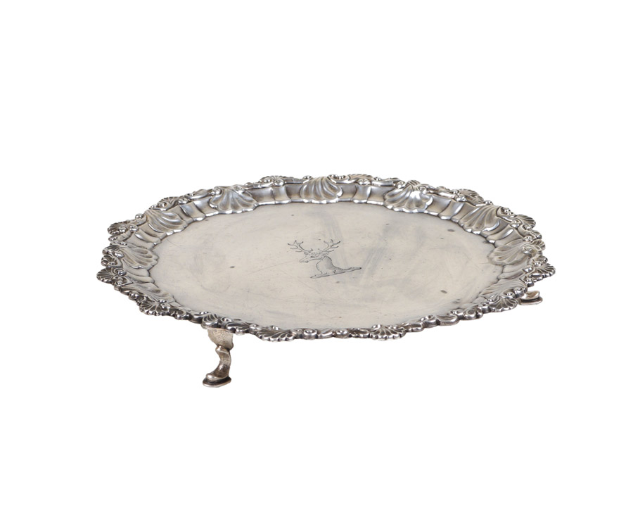 PICCOLO SALVER IN ARGENTO Londra, Giorgio III, 1761 orafo Ebenezer Coker, forma circolare, profilo sbalzato a motivo di conchiglie e volute, poggiante su tre piedini a zoccolo, collezione Petochi, Roma, cm.2,5x19 peso 265 gr.