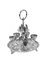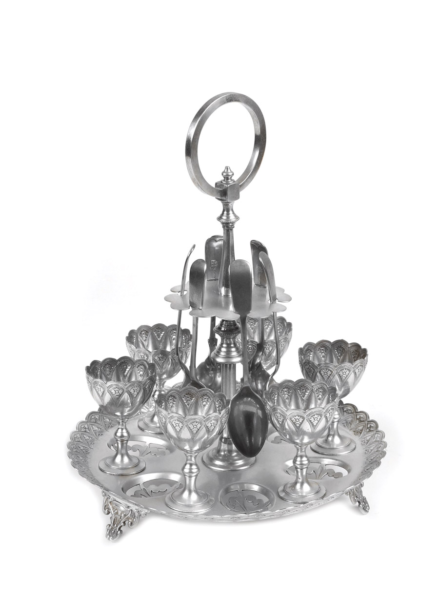 PORTAUOVA IN METALLO ARGENTATO Inghilterra, inizio XX Sec. forma circolare poggiante su tre piedini a voluta, sei coppette portauova e sei cucchiaini, presa con manico circolare 27x21 cm.