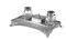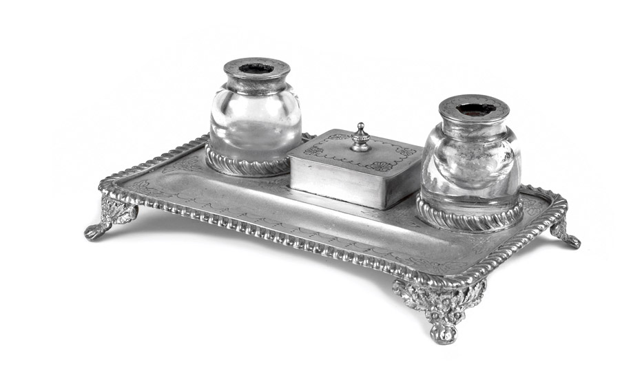 CALAMAIO IN METALLO ARGENTATO inizio XX Sec. due ampolle su vassoietto ovale poggiante su quattro piedini ferini 2x20x13 cm.