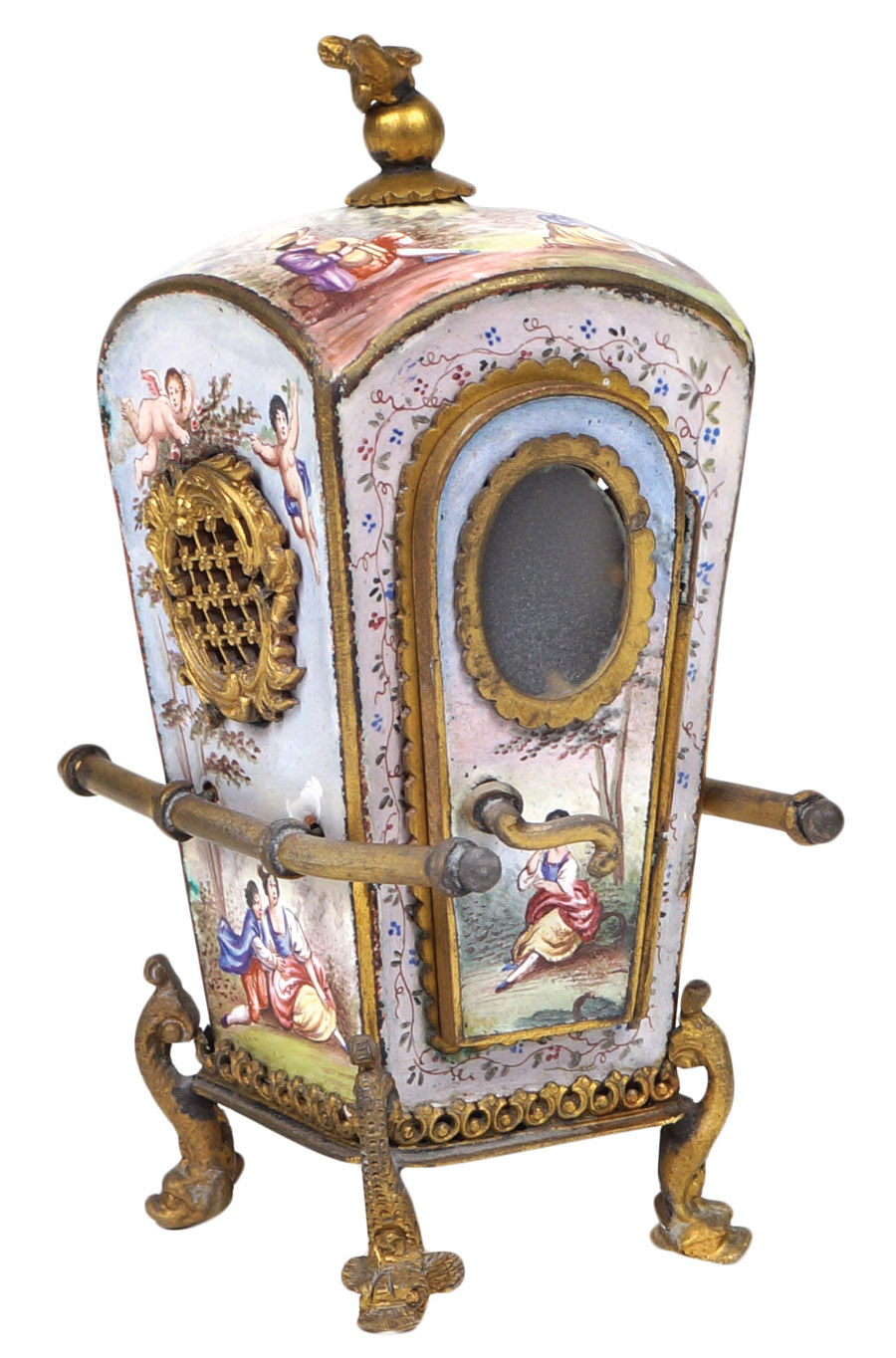 PORTANTINA IN SMALTO E BRONZO DORATO Vienna, 1870 circa superficie interamente decorata con scene galanti e di paesaggi in miniatura, lievi difetti 10x6,5x4 cm.