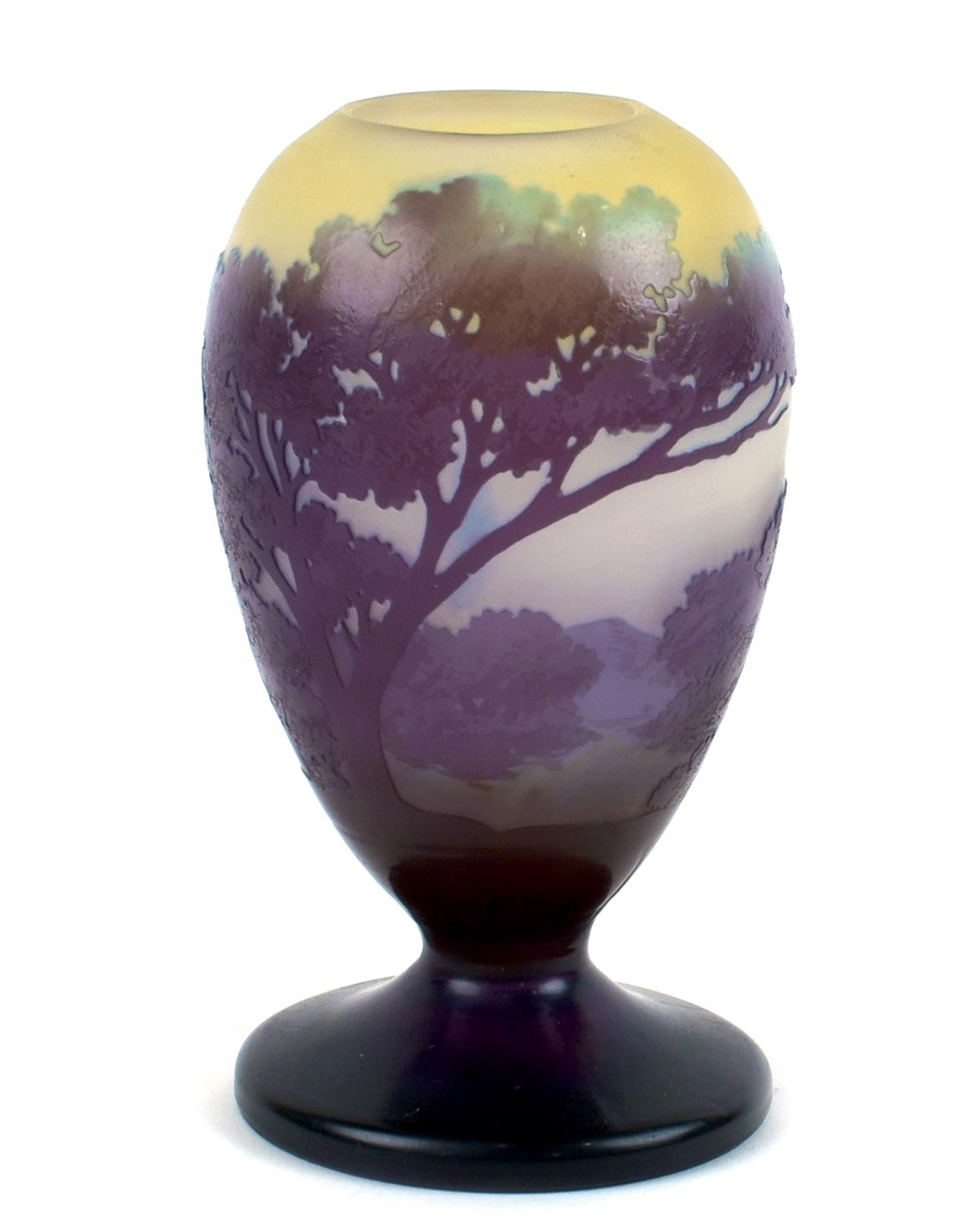 EMILE GALLÈ Nancy 1846 - 1904 piccolo vaso in vetro a cammeo decorato all'acido a motivo di paesaggio, firmato h. 13 cm.