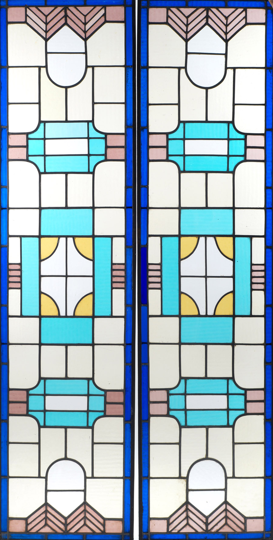 COPPIA DI VETRATE ARTISTICHE anni'30 in vetro colorato a gran fuoco legato a piombo a collage raffiguranti disegni geometrici di stile Deco' 47x187 cm. cad.