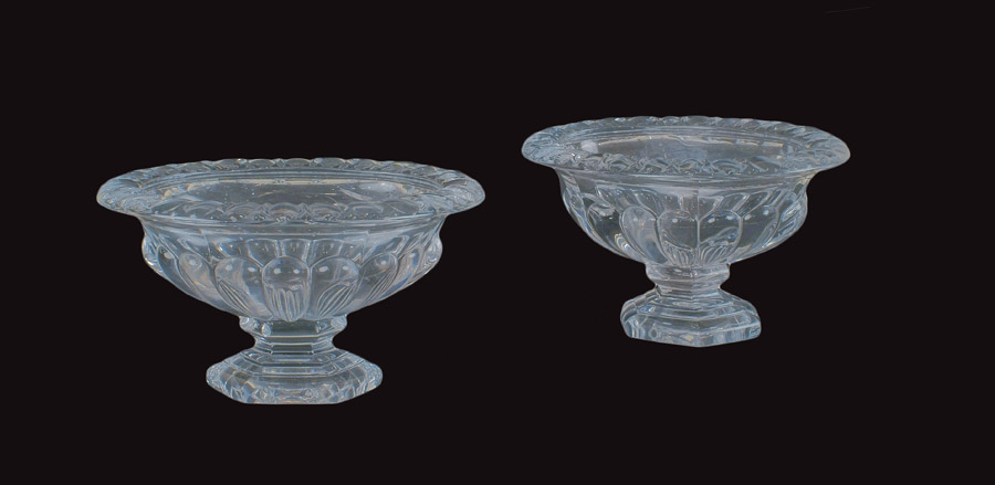 COPPIA DI ALZATE IN CRISTALLO MOLATO XX Sec. corpo ovale baccellato poggiante su base esagonale 15x27x19 cm.