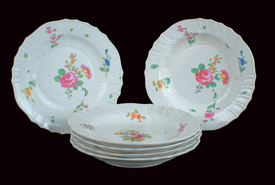 SEI PIATTI IN PORCELLANA Vienna, XIX Sec. su fondo bianco dipinti in policromia a motivo floreale, (difetti) d. 25 cm.