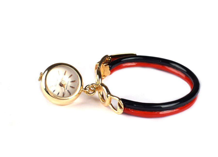 PARTICOLARE BRACCIALE GUCCI VINTAGE anni 70/80 in metallo dorato e smalto policromo, con orologio pendente a sfera, movimento meccanico a carica manuale a vista, con scatola, diametro cm. 67 peso 67,7 gr.
