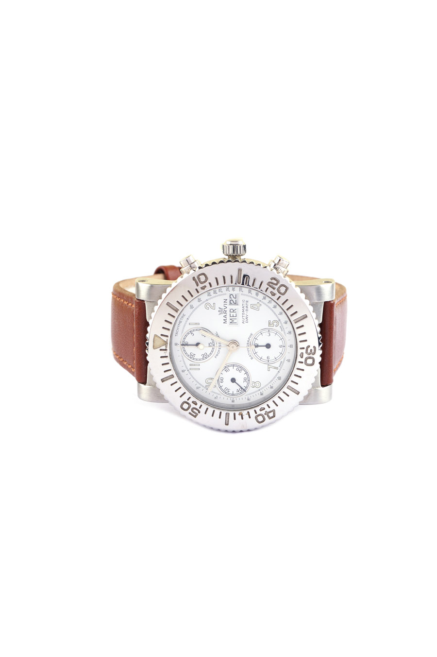 OROLOGIO DA POLSO MARVIN BATHYGRAPHE Day Date Automatic Sub Professional, cronografo in acciaio, cassa tonda mm. 40, quadrante bianco tricompax, datario ore 3, vetro zaffiro, ghiera girevole, movimento meccanico a carica automatica, corona a vite, cinturino in pelle con fibbia in metallo, completo di scatola e garanzia