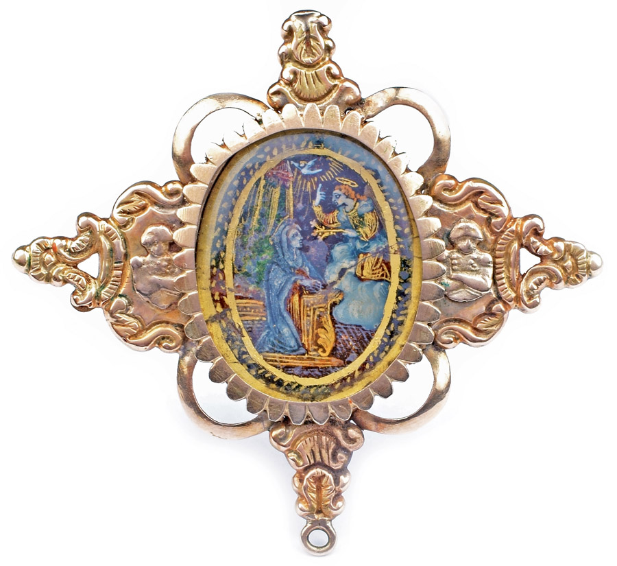 PARTICOLARE SPILLA BORBONICA IN ORO ROSSO E GIALLO probabile arte fiamminga...