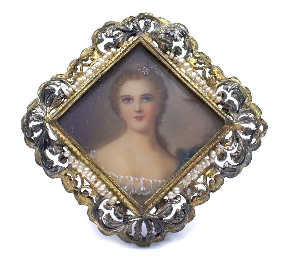 Lot 344 | SPILLA IN ORO GIALLO, ARGENTO E MICROPERLINE con miniatura dipinta in...