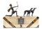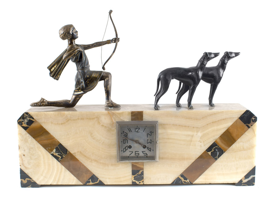GRANDE OROLOGIO ART DECÒ DA TAVOLO Francia, XX Sec. cassa in marmi vari centrata da quadrante di forma quadrata con indici numeri arabi e sormontata da scultura in bronzo raffigurante Diana cacciatrice con levrieri, movimento meccanico 47x63x12 cm.