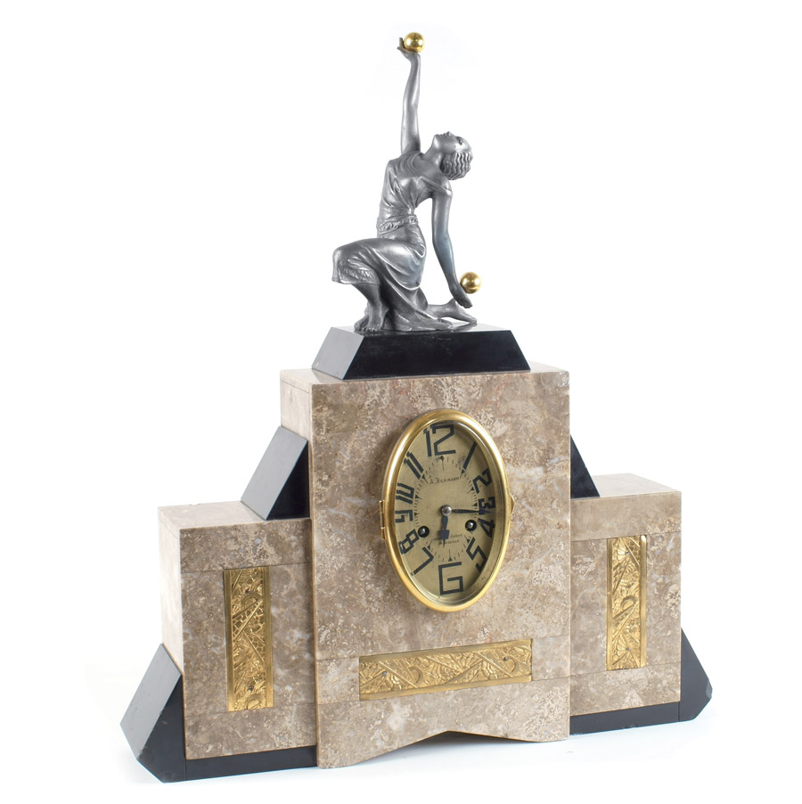 OROLOGIO ART DECÒ DA TAVOLO Francia, XX Sec. cassa in marmi vari con applicazioni in bronzo dorato, centrata da quadrante dorato ovale firmato A. Herman con indici numeri arabi e sormontata da una figura femminile in metallo, movimento meccanico (difetti) 55x48x10 cm.