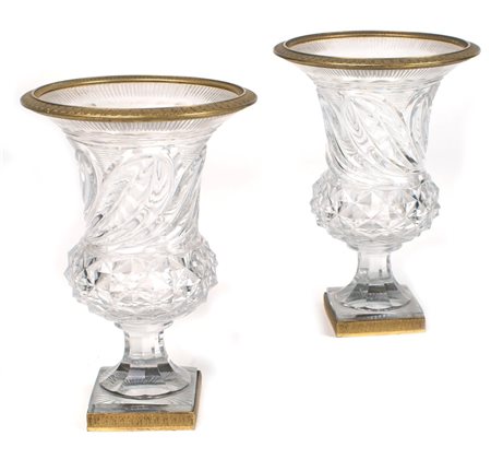 COPPIA DI VASI MEDICEI IN CRISTALLO MOLATO Francia, fine XIX Sec. con profili in bronzo dorato, base quadrata h. 21 cm.