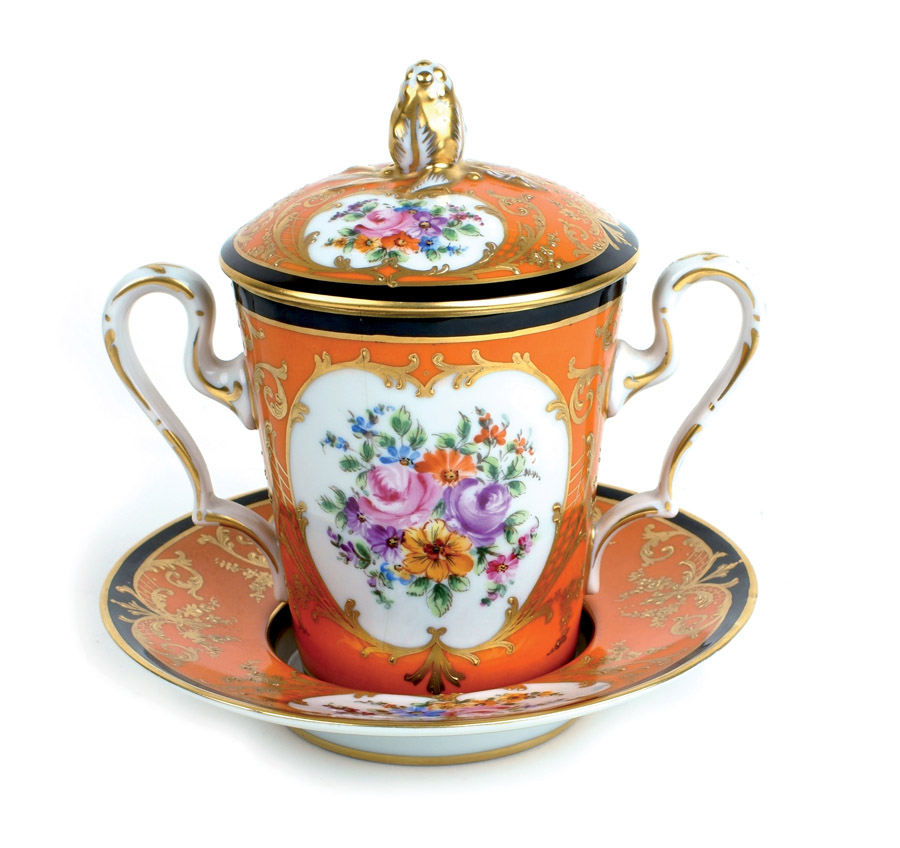 TAZZA CON COPERCHIO E PIATTINO IN PORCELLANA Francia, inizio XX Sec. dipinta in policromia e parzialmente dorata, decorata a motivi floreali 15x16 cm.