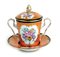 TAZZA CON COPERCHIO E PIATTINO IN PORCELLANA Francia, inizio XX Sec. dipinta...