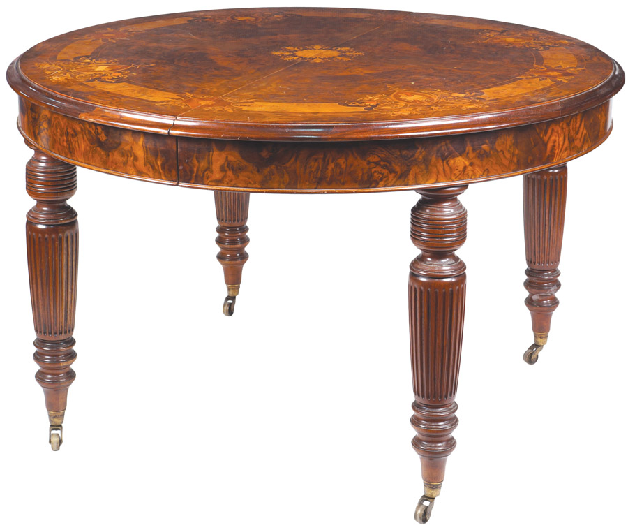 TAVOLO ALLUNGABILE IN NOCE Inghilterra, XX piano circolare riccamente...