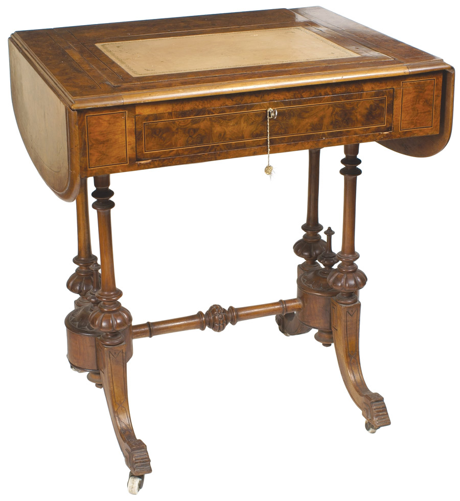 TAVOLO SCRITTOIO IN NOCE E RADICA DI NOCE Inghilterra, XIX Sec. piano rettangolare basculante con alette rivestito in pelle e un tiretto sottostante, poggiante su sostegni torniti e riuniti al centro, piedini provvisti di rotelle, cm. 75x105x56 (aperto) 75x76x56 cm.